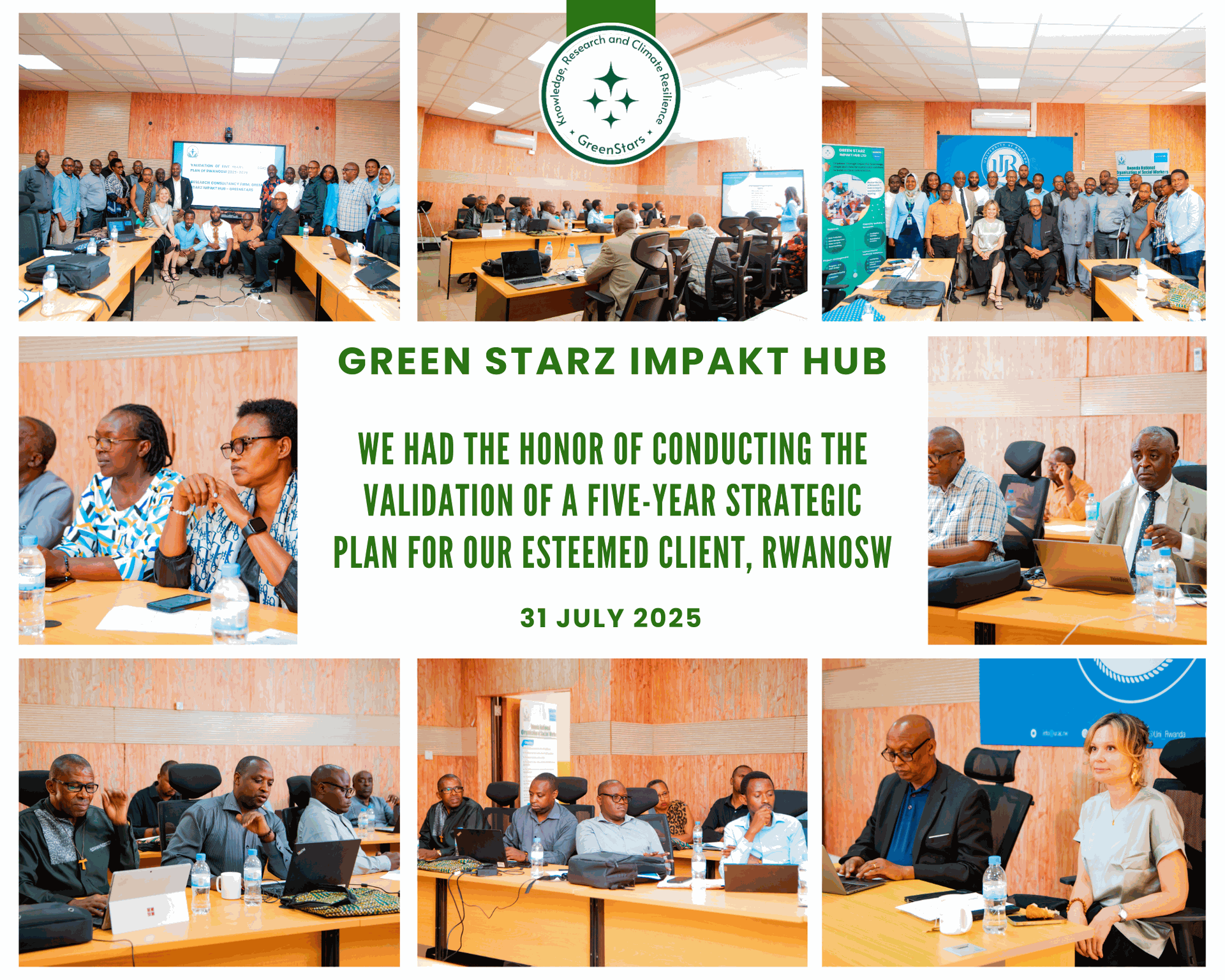 Green Starz Impakt Hub (abbreviated as “GreenStars”) is a social enterprise registered and domiciled in Rwanda with principal activities of Research, Capacity building, and environmental sustainability and climate mitigation. As a Social Enterprise dedicated to fostering sustainable development through professional training and consultancy services. Our mission includes providing high-quality research professional training while simultaneously enhancing climate resilience.
